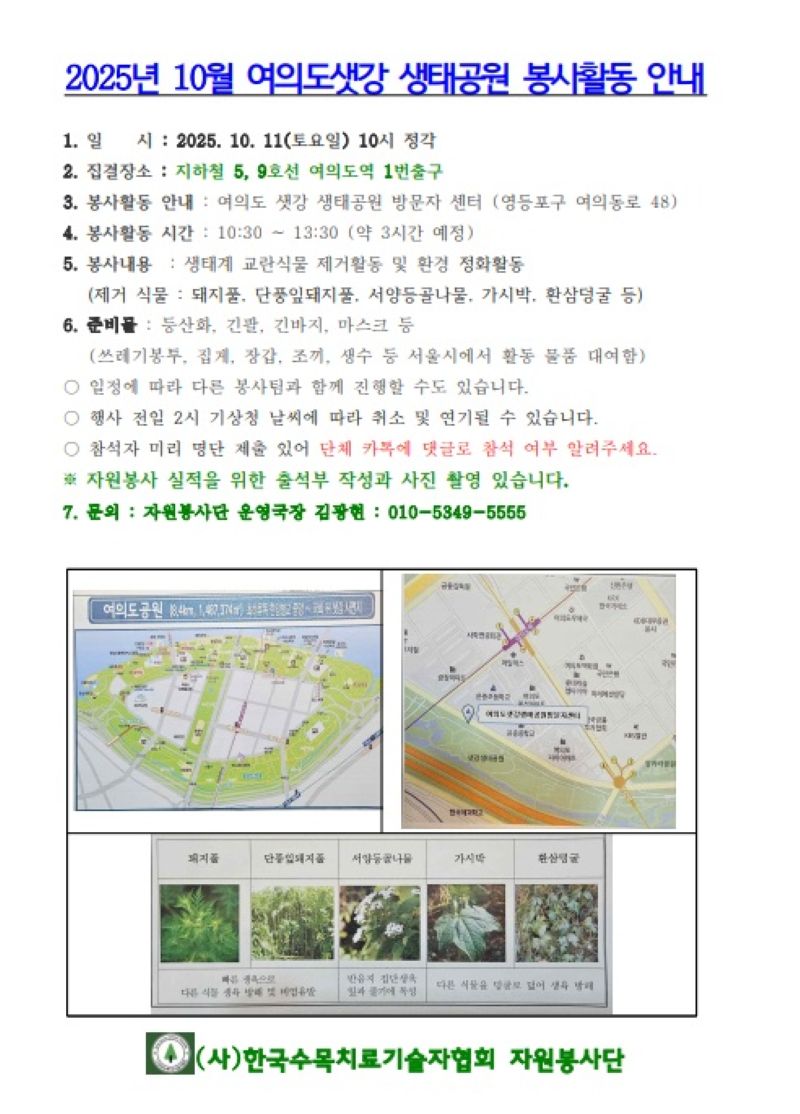 2025년 10월 11일(토) 한국수목치료기술자협회 자원봉사단 활동 공지입니다.