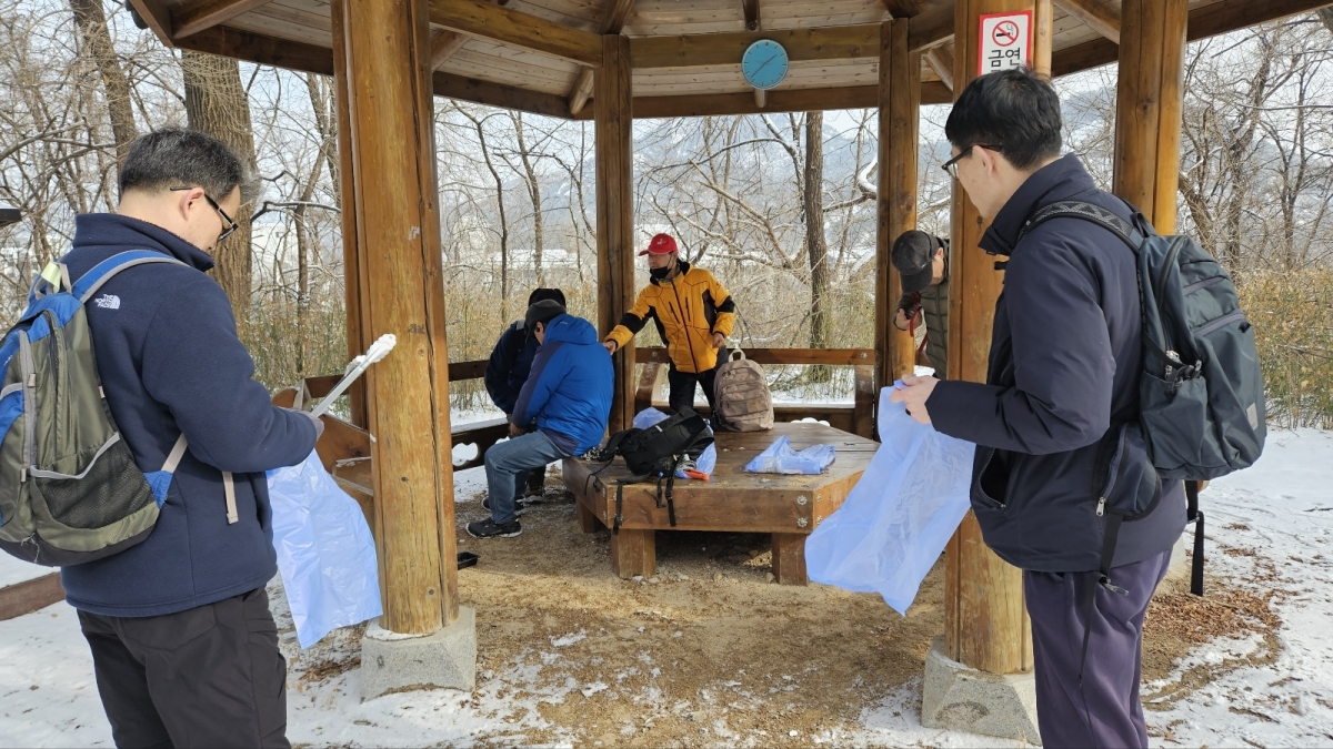개인별로 가져온 집게와 협회에서 준비한 쓰레기 수거 비닐을 배부하며 자원봉사활동을 준비합니다. 눈이 온 자락길에 미끄럼 주의사항도 전달하고요~~
