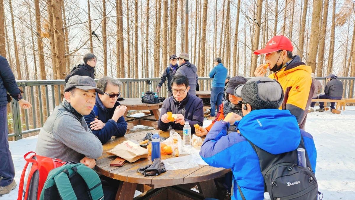 안산 자락길에는 숲속의무대란 쉬는 공간이 있습니다. 주변에 메타스쿼이아가 숲을 이루어 그렇게 지어진 이름 같습니다. 여기서 회원님들이 준비한 귤과 영천꽈배기, 모찌떡, 과자로 회원간의 교제가 풍성합니다. 사사로운 이야기부터 나무의 전문적인 이야기까지 ...이야기를 듣다보면 여기에 고수님들이 계십니다. ㅎㅎ